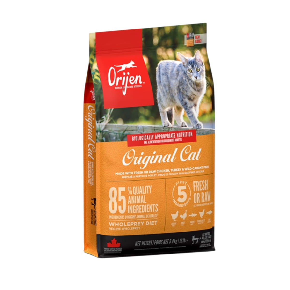 Orijen Dry Cat Food, made with 85% high-quality animal proteins, rich in fresh chicken, turkey, and wild-caught fish (5.4 kg)