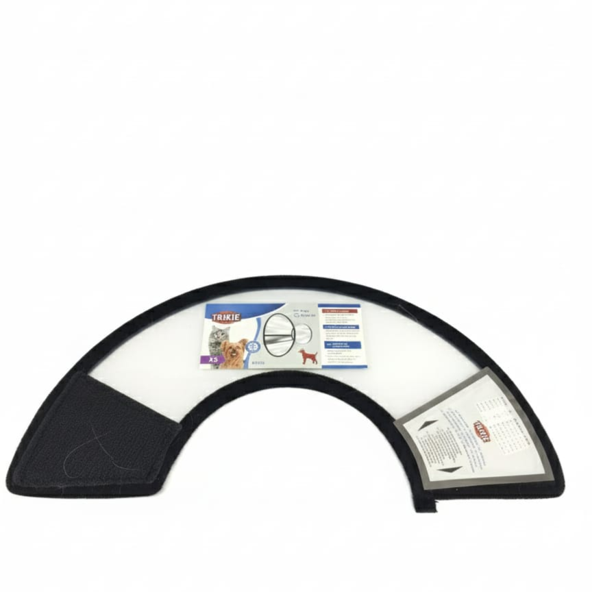 This extra small to small size recovery collar features a sleek black design made from soft, flexible material. It serves as a comfortable alternative to traditional plastic e-collars, effectively preventing cats from accessing wounds or surgical sites while maintaining their comfort during the recovery period.