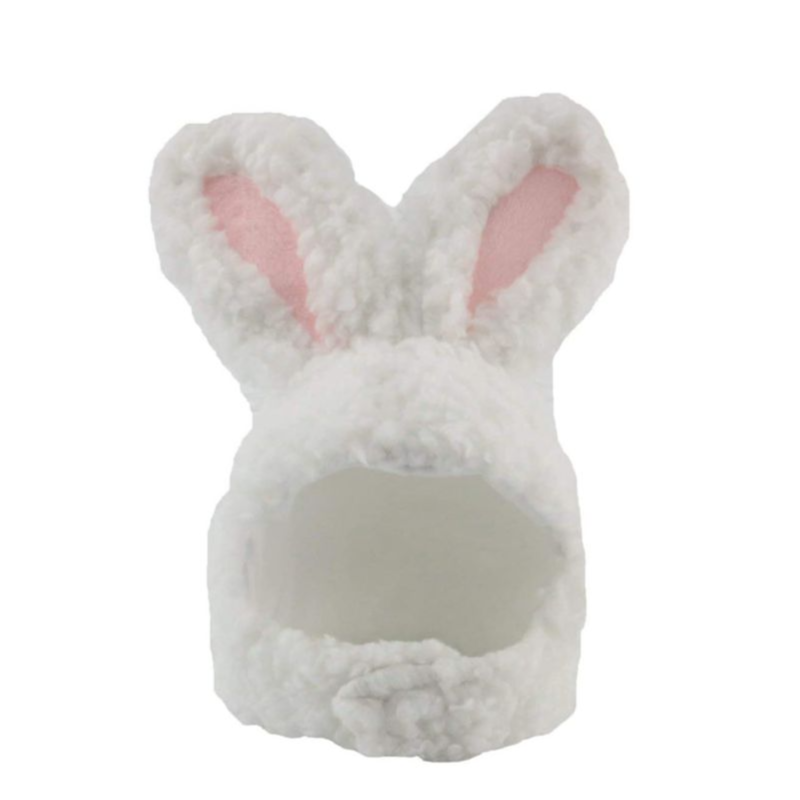 An adorable pet hat featuring plush white fabric with charming bunny ears design. The ears are accented with soft pink inner panels, creating a sweet and playful look perfect for pets who love to dress up in cute accessories.
