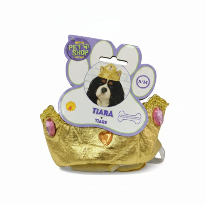 A luxurious gold pet tiara adorned with decorative gemstones, designed specifically for pets. This elegant crown accessory features a metallic gold finish and colorful faux jewels, perfect for making your pet feel like royalty during special occasions or photo sessions.