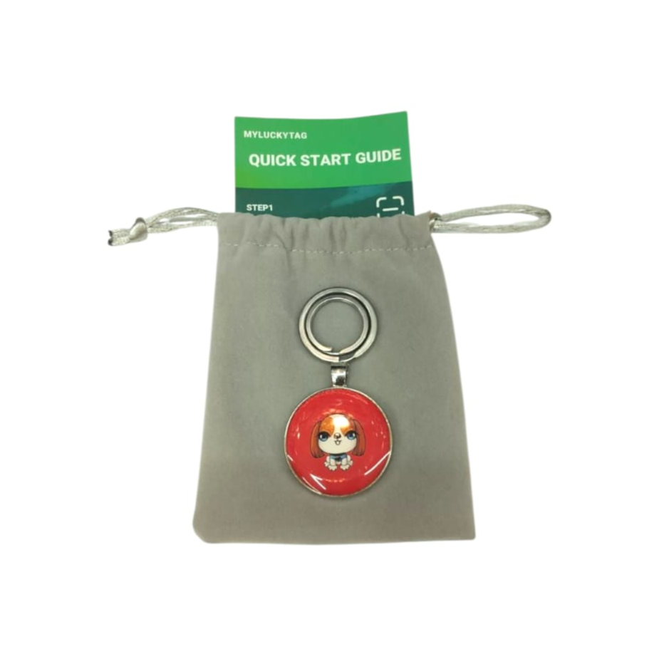 The Elegant Pet ID Tag combines modern QR technology with charming design, featuring a cute cartoon puppy illustration on a red background. This smart tag comes with a durable metal ring attachment and is packaged in a gray drawstring pouch with an included quick start guide for easy setup.