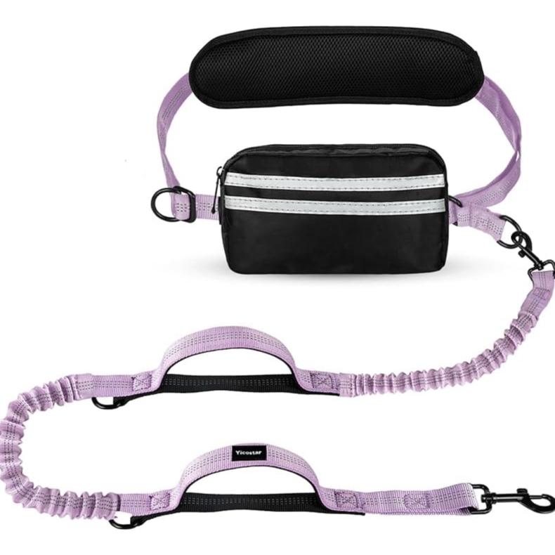 This hands-free dog leash combines functionality with style, featuring a retractable leash (142-175cm) and an adjustable waist belt (69-150cm) with an integrated storage bag. The purple and black design offers both aesthetic appeal and practical features for comfortable, hands-free dog walking.