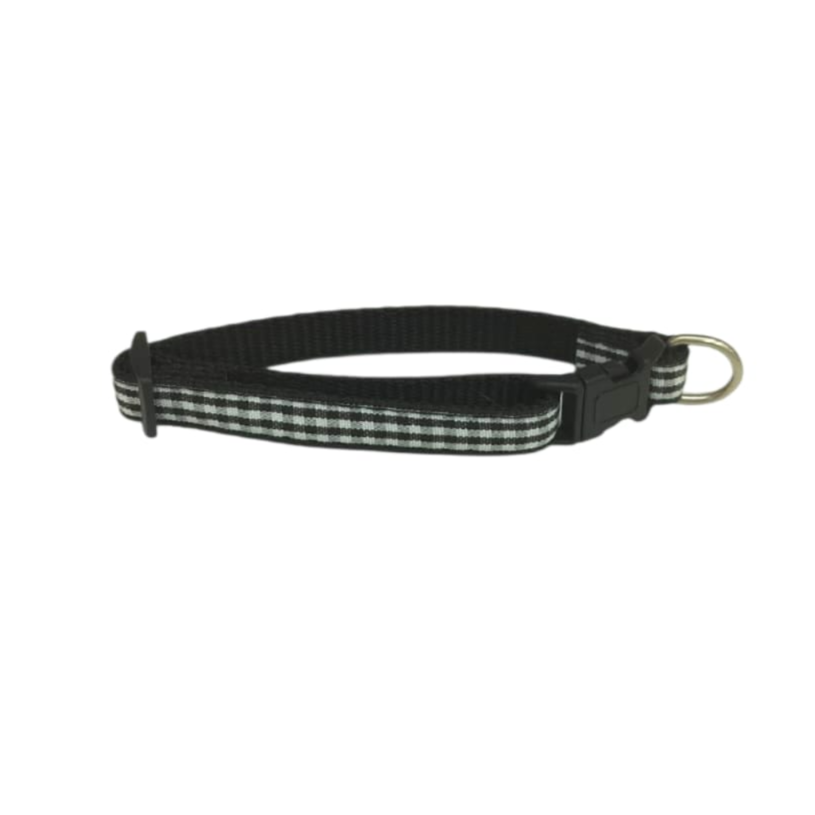 This stylish pet collar features a black and white gingham pattern with an adjustable length of 27 cm. The design combines durability with aesthetic appeal through its plastic quick-release buckle, metal D-ring, and coordinated black trim.