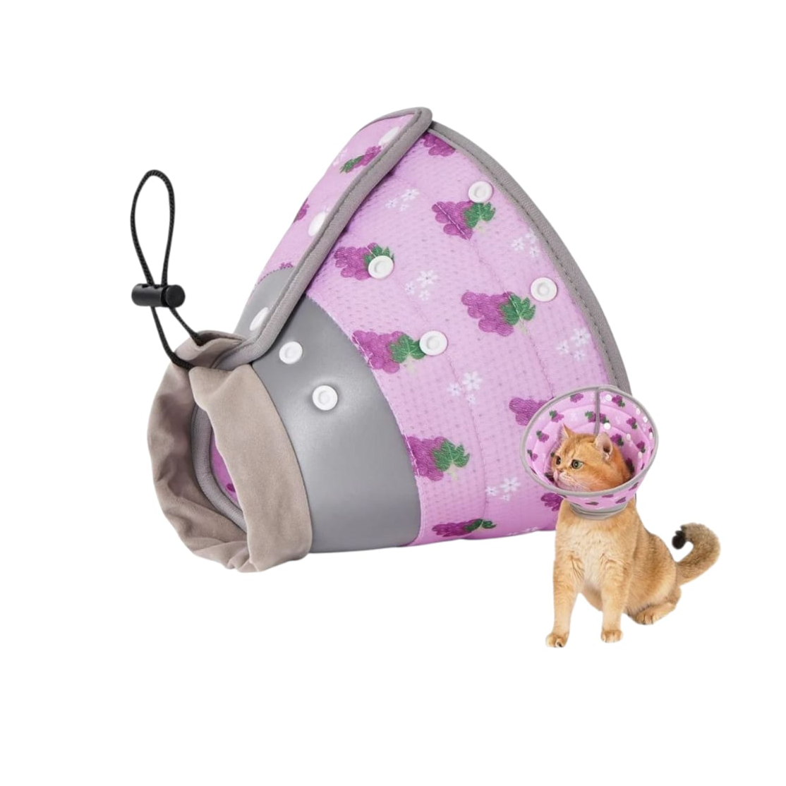 This medium-sized recovery collar offers a comfortable alternative to traditional plastic e-collars, featuring a soft pink fabric with floral patterns and gray trim. Designed to prevent pets from accessing wounds or surgical sites while ensuring maximum comfort during the recovery period.