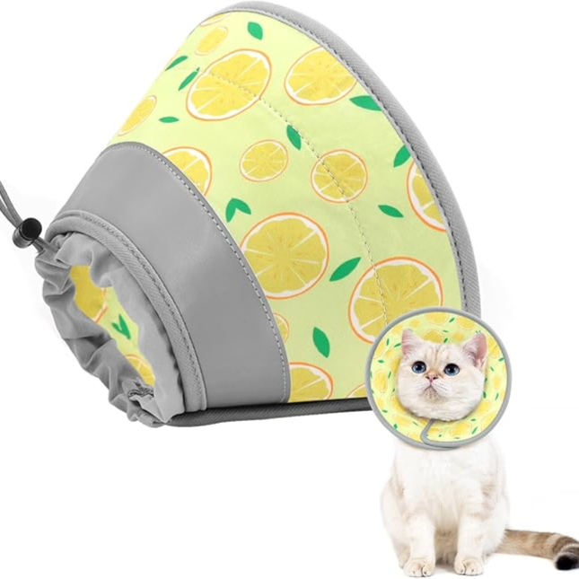 This small-sized recovery collar features a cheerful lemon print design on a light yellow background with gray trim. Made from soft, lightweight materials, it offers a comfortable and stylish alternative to traditional plastic e-collars while effectively preventing pets from accessing wounds or surgical sites.