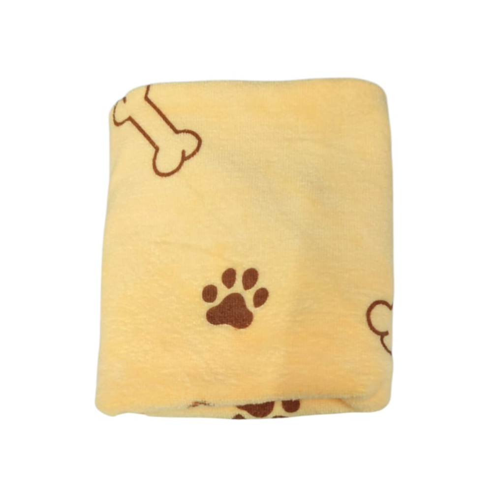 A specialized pet towel designed with a soft yellow base and adorable brown paw print and bone patterns. Measuring 70×44 cm, this super absorbent and washable towel provides an effective solution for drying pets after baths or outdoor activities.