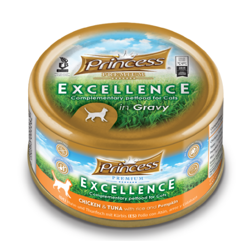 Princess Excellence Cat Wet Food – Chicken & Tuna with Rice & Pumpkin, 70g A wholesome blend of tender chicken and tuna, complemented by rice and fiber-rich pumpkin. Formulated to support digestion and overall feline health with natural ingredients and balanced nutrition. Ideal for both kittens and adult cats who enjoy savory, nourishing meals.
