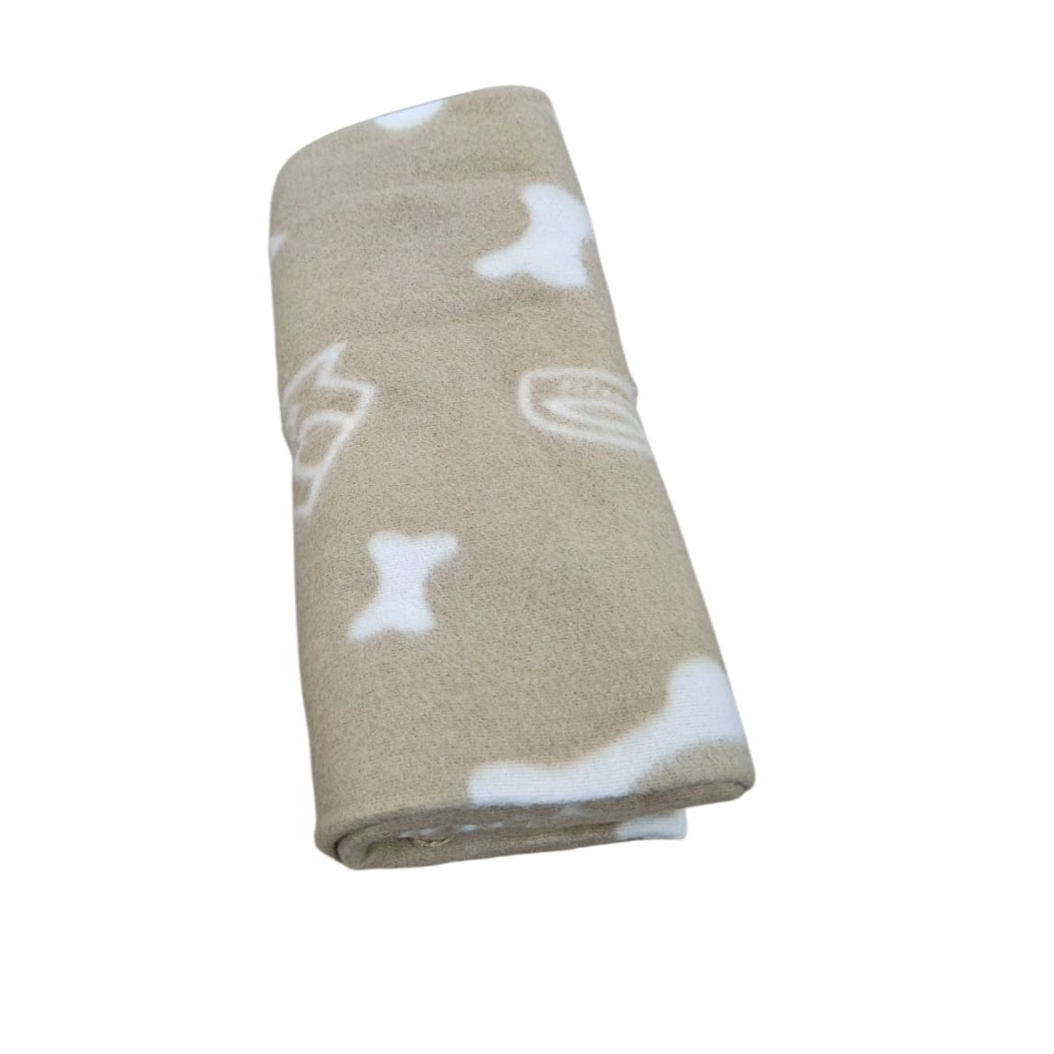 A soft and lightweight pet blanket featuring a beige base color with white bone and paw print patterns. Measuring 102cm x 71.5cm, this blanket provides a cozy and stylish resting space for pets while maintaining functionality and ease of care.