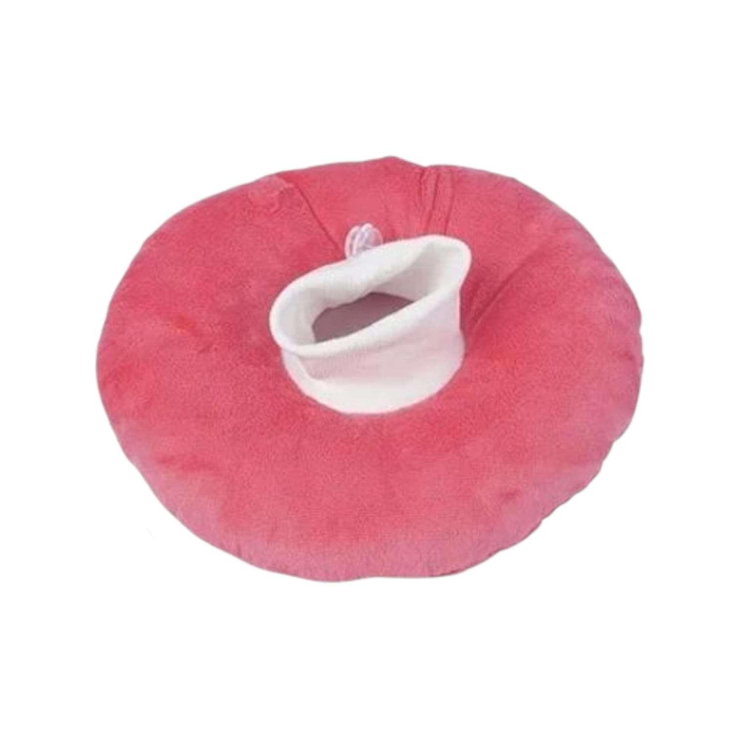 This medium-sized recovery collar features a soft, plush design in pink with a white inner trim, offering a comfortable alternative to traditional plastic e-collars. The adjustable design helps prevent cats from accessing wounds or surgical sites while ensuring comfort during the recovery period.