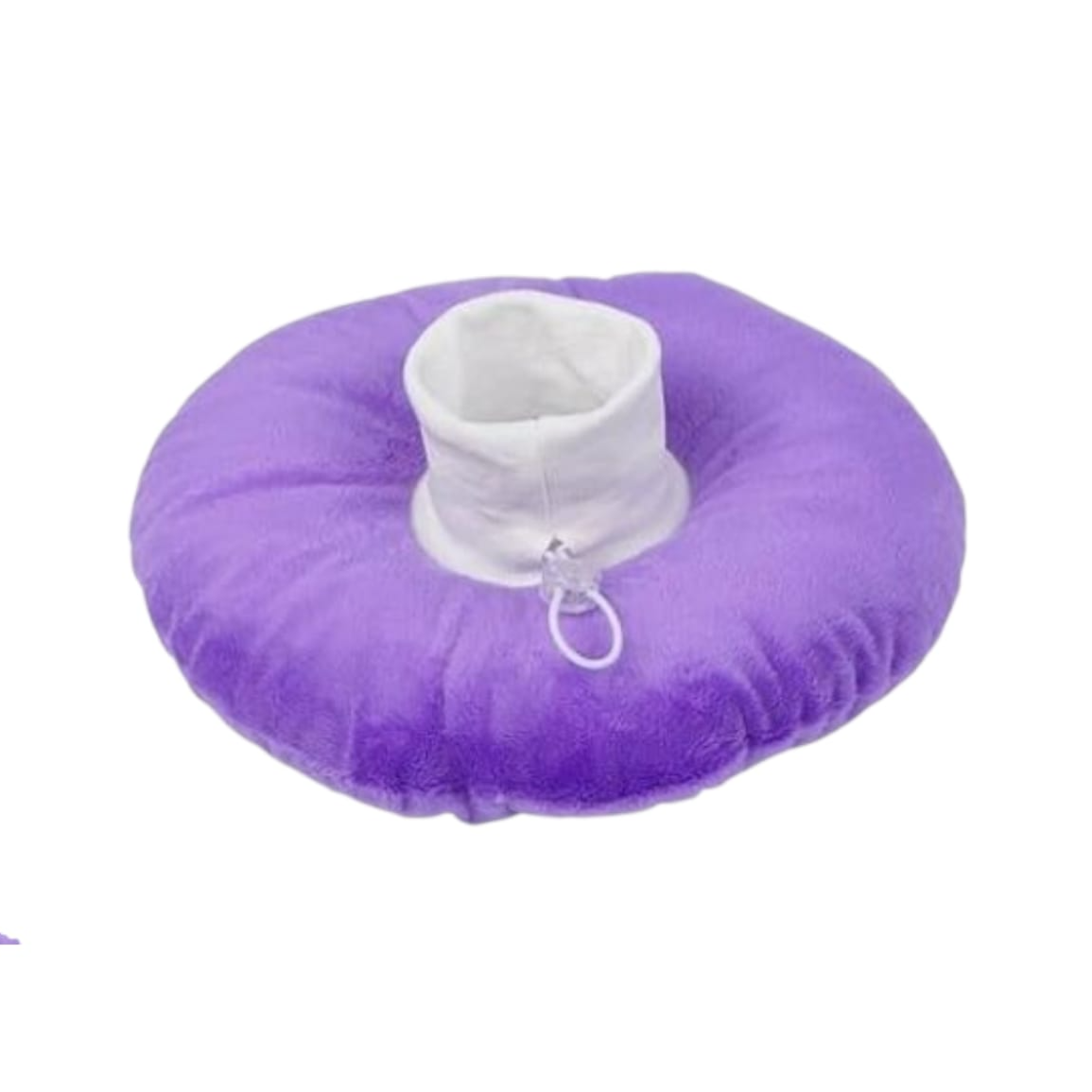 This medium-sized recovery collar features a plush purple exterior and soft white interior with an adjustable drawstring closure. Designed as a comfortable alternative to traditional plastic e-collars, it helps prevent cats from accessing wounds or surgical sites while ensuring comfort during the recovery period.
