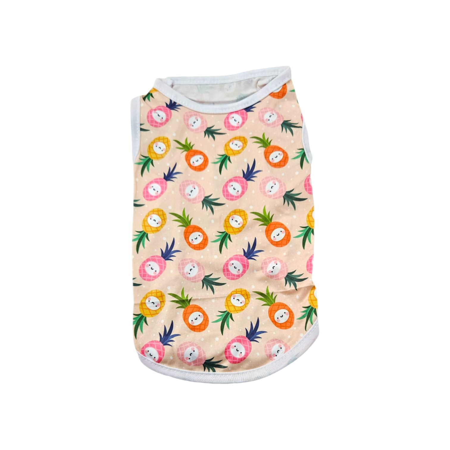 A charming summer pet shirt in size small featuring a delightful tropical fruit pattern with smiling pineapples, oranges, and pink fruits on a light beige background. Made with soft, breathable fabric for everyday comfort during warm weather.